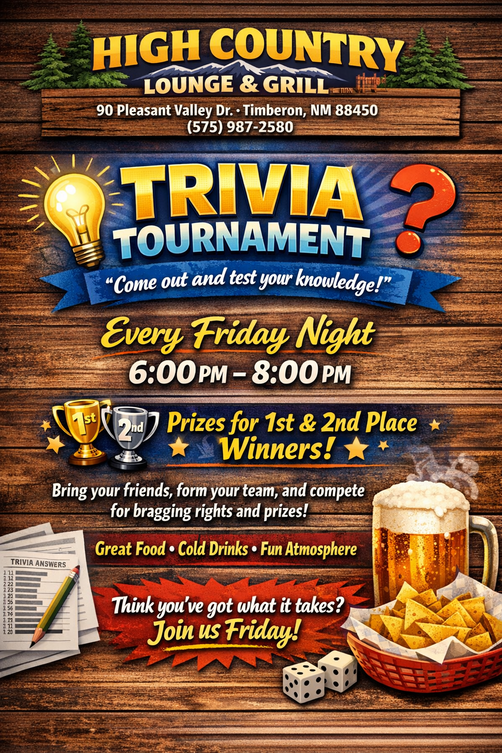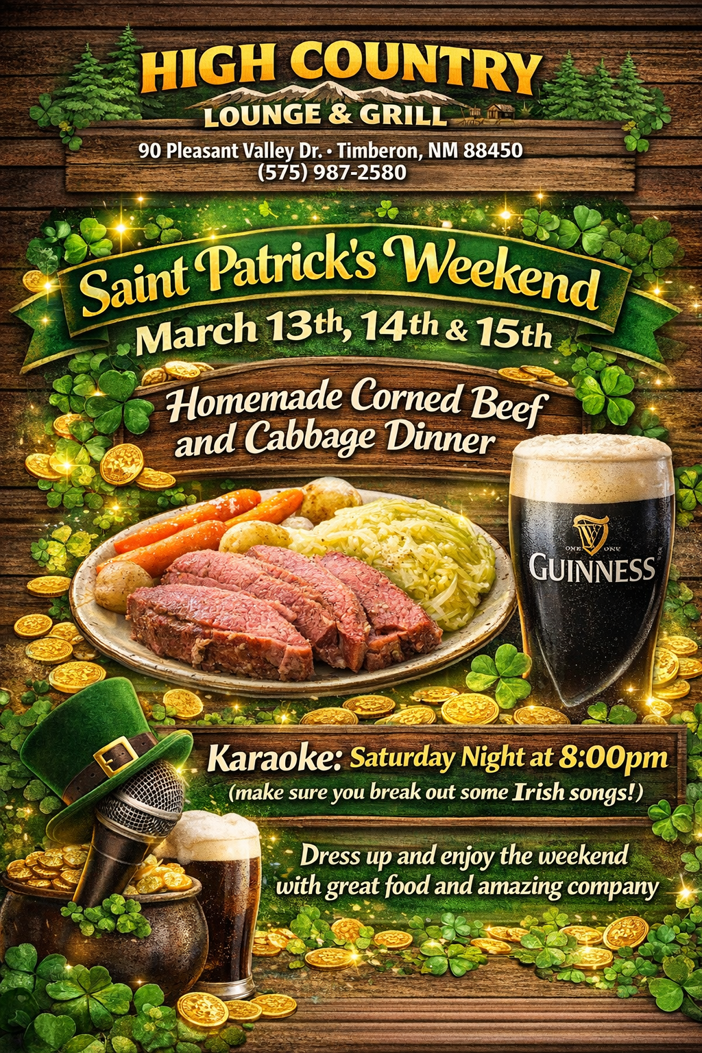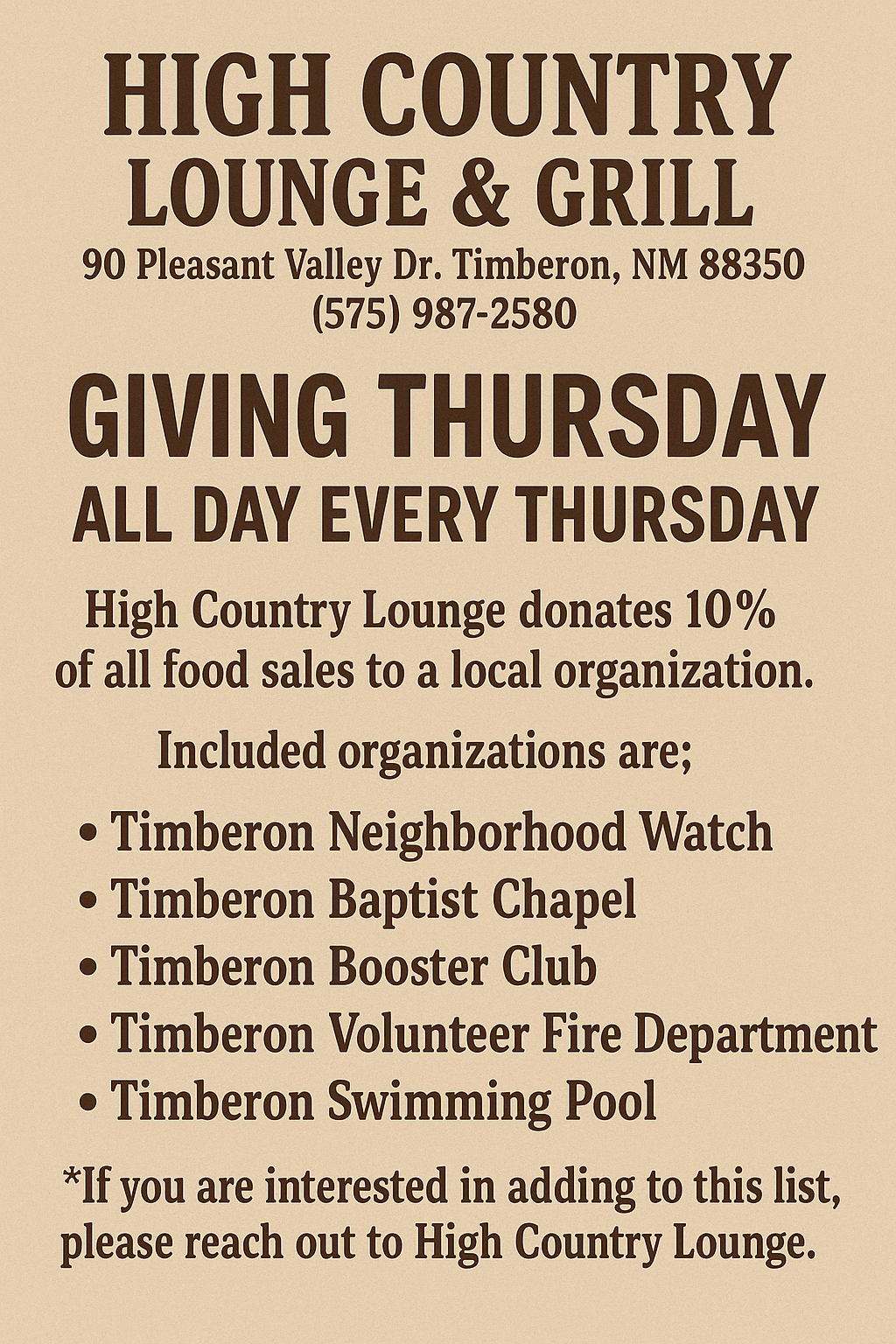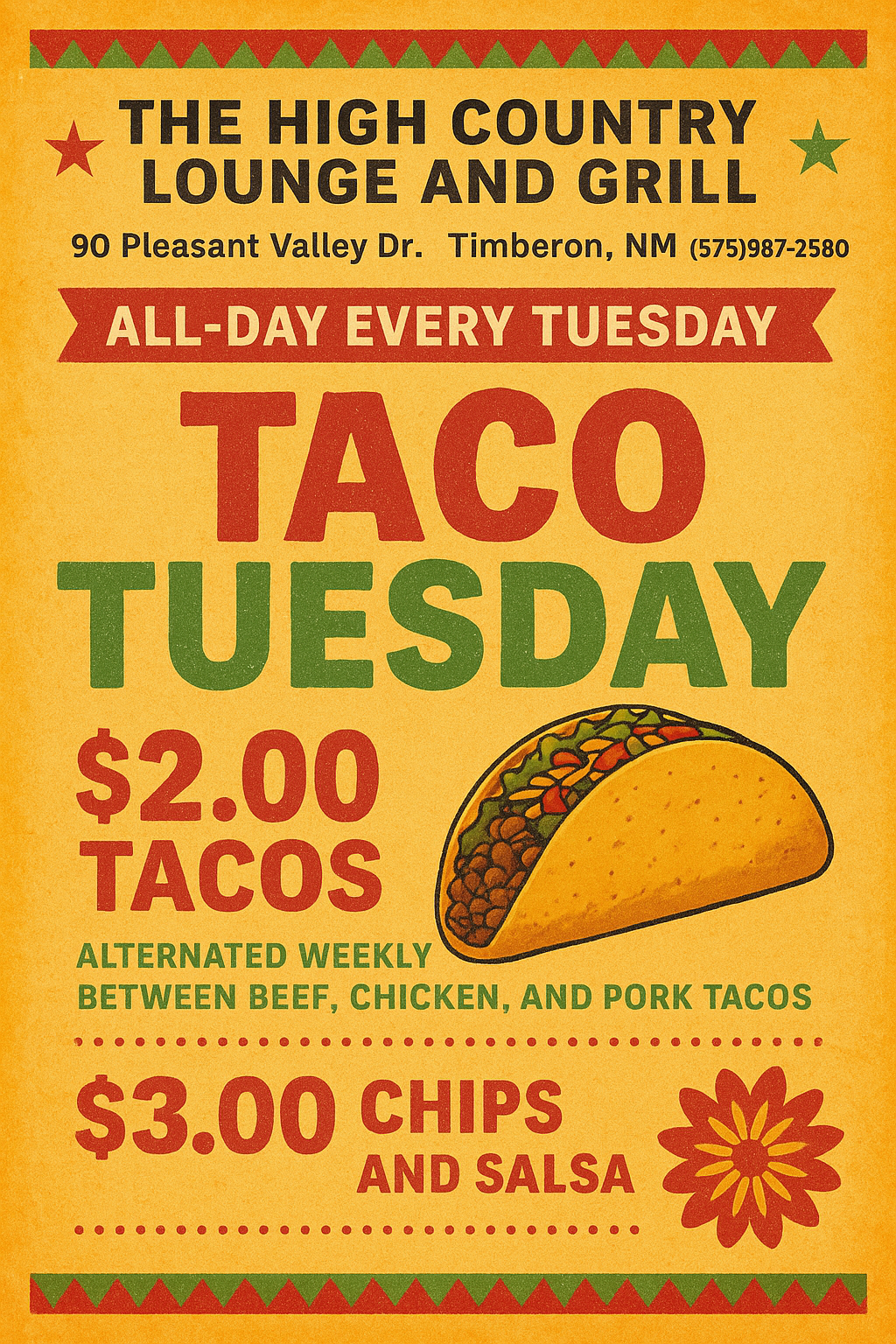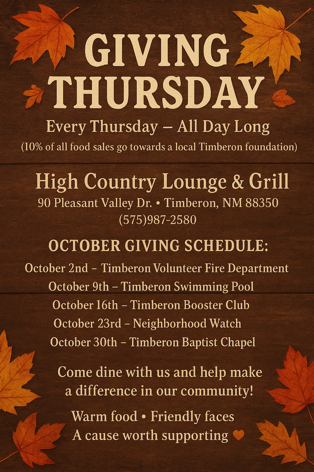 90 Pleasant Valley Road - Timberon, NM 88350 575-987-2580 Winter Hours starting Nov 1, 2025: Sunday - Monday-Tuesday-Thursday: 12:00 - 8:00 pm Friday: 12:00 - 11:00 pm Saturday: 12:00 pm - 1:00 am Wednesday: CLOSED